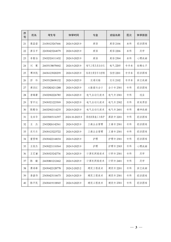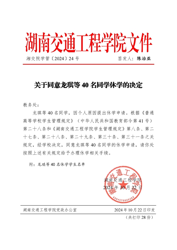 关于同意龙琪等40名同学休学的决定(湘交院学管〔2024〕24号)