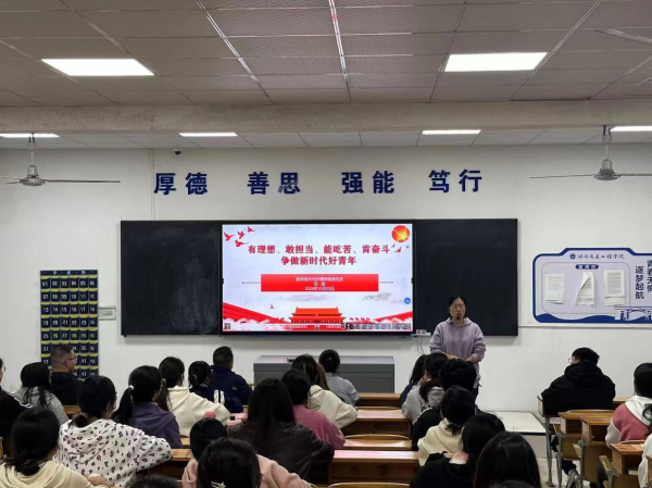 课堂上,学院党总支书记邓丽以《争做新时代好青年》为题,勉励广大学子要有理想、敢担当、能吃苦、肯奋斗,引导学生树立正确的世界观、人生观和价值观,培育其社会责任感和使命感。