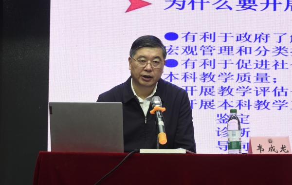 韦成龙作《坚持以评促改、强化内涵建设,不断完善提高教学质量的长效机制》专题讲座,围绕本科教学评估基本概况、合格评估指标体系解读、人人肩上指标责任落实等三个方面进行了详细解读,提出了改进建议。他指出,本科教学评估是对办学情况的全面检阅、是对“一二三四”新要求的全面检查,事事都是评估对象、处处都要现场考察、人人肩上都有指标。为此,他提出四点建议:一是心无旁骛,集中精力,充分认识合格评估的重要意义;二是目标牵引,突出重点,明确合格评估的重点任务;三是服从大局,校兴我荣,顺利通过合格评估有我;四是谋定而动,快乐评估,确保预期评估目标实现。