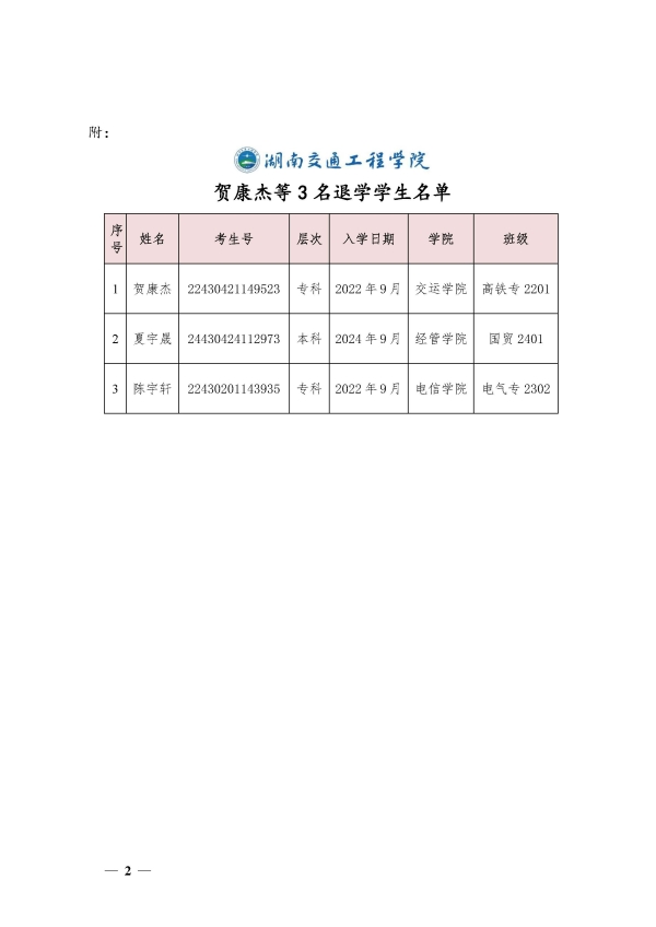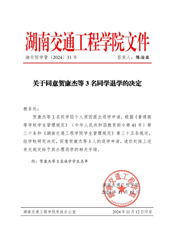 关于同意贺康杰等3名同学退学的决定(湘交院学管〔2024〕31号)