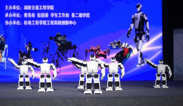 在“器”宇轩昂,“智”向未来--人形与四足机器人舞台大秀展示中,表演人形机器人编队和四足机器人编队。