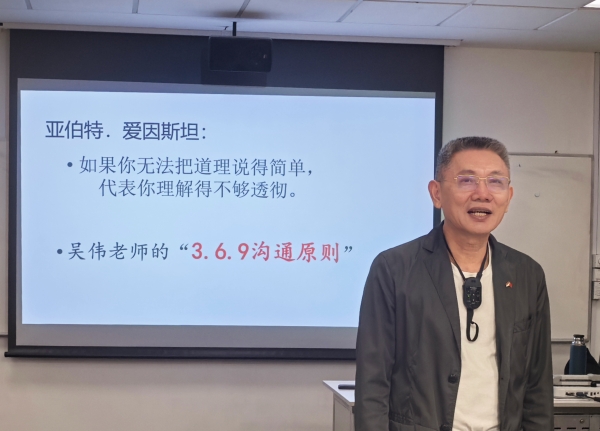 讲座开篇,吴教授点明当今全球大变局下,人类面临“VUCA”(Volatile动荡不安、Uncertain不确定、Complex复杂、Ambiguous模糊不清)四大挑战,并提出可从“轻、快、准、显、积、简”六方面应对,着重阐述“简”这一要点。他以老子“大道至简”的思想说明复杂事务宜用简单思维处理,同时列举乔布斯发明iPhone及马斯克研发航天发动机简化设计的实例,论证“简单即最好”。此外,吴教授讲解了其“3、6、9沟通原则”,强调其在人际沟通中的适用性,指出成功源于重复做简单有效的事。