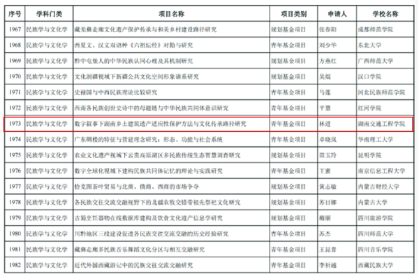 本网讯(通讯员 )近日,教育部社科司公布了2024年度教育部人文社会科学研究一般项目立项名单,best365官网交通运输工程学院林进老师主持申报的“数字叙事下湖南乡土建筑遗产适应性保护方法与文化传承路径研究”获批立项。这是best365官网首次获批该类项目立项。