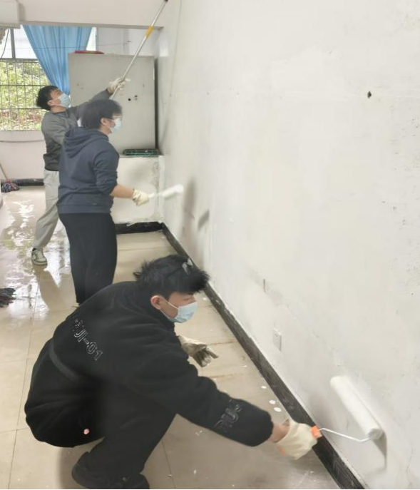 活动当日,他们身着便装,熟练地搅拌涂料、挥舞刷子,墙上污渍渐消,墙面洁白如新。大家分工协作,交流粉刷技巧,现场热火朝天。