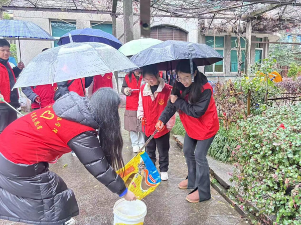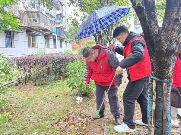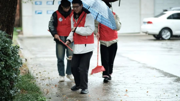 争做文明先行者,收获爱也传递爱,志愿者们分组带领学员进行爱心接力,在雨中挥舞着劳动工具,共创美好社区环境,为文明城市贡献自己的一份力量!
