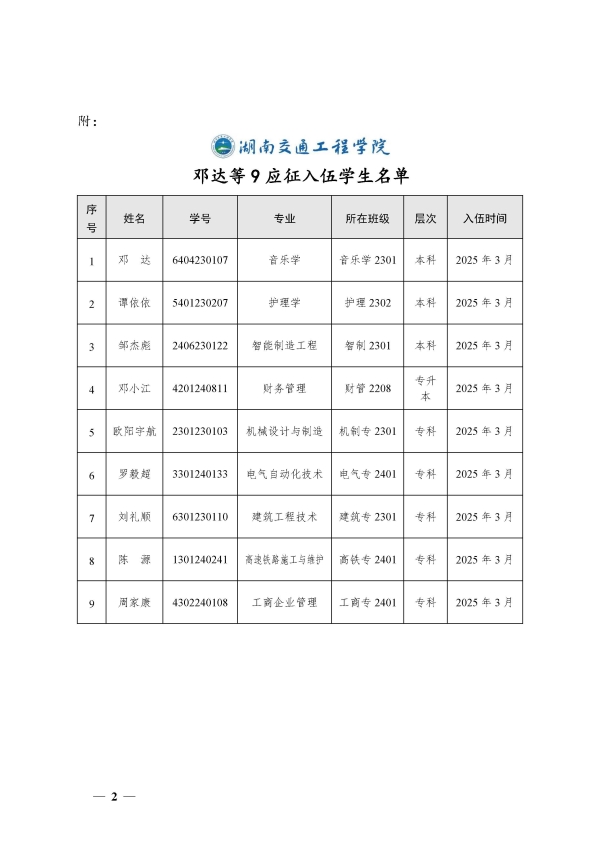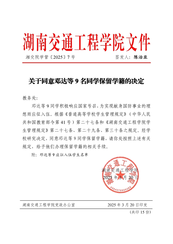 关于同意邓达等9名同学保留学籍的决定(湘交院学管〔2025〕7号)