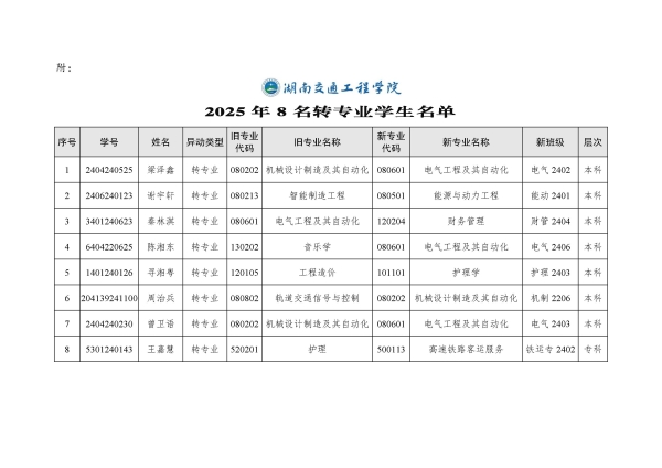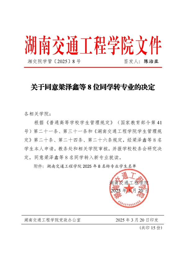 关于同意梁泽鑫等8位同学转专业的决定(湘交院学管〔2025〕8号)