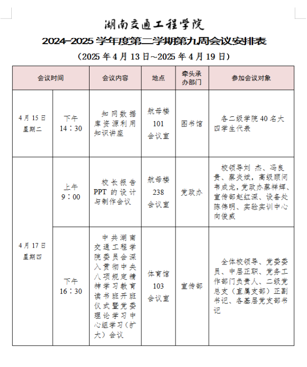 best365中国官方网站2024-2025学年度第二学期第九周会议安排表
