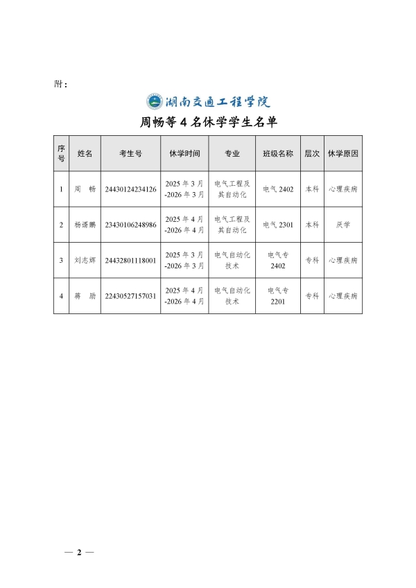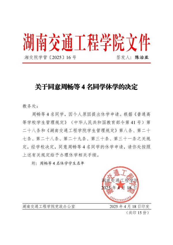 关于同意周畅等4名同学休学的决定(湘交院学管〔2025〕16号)