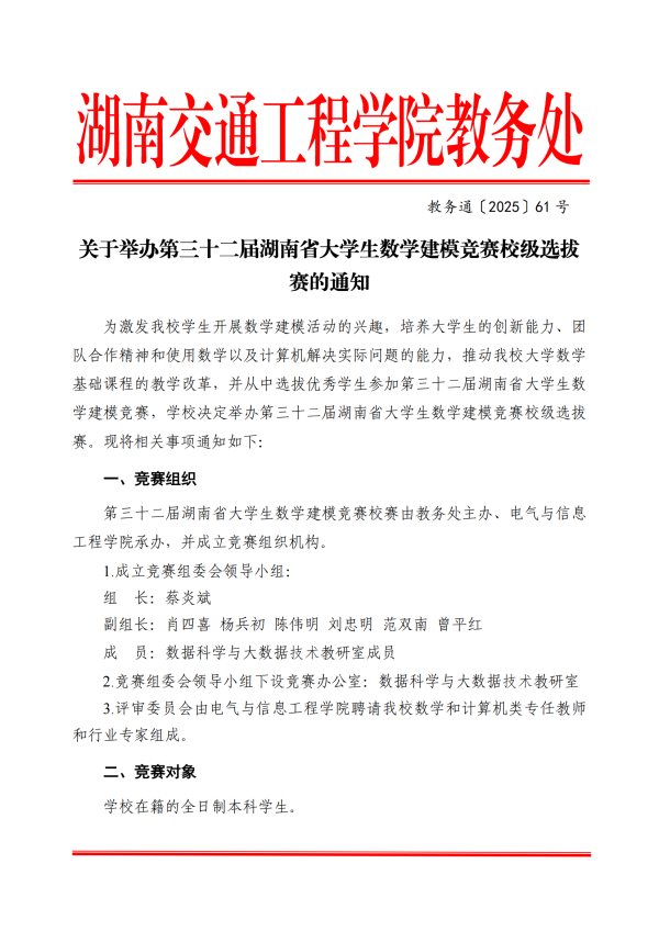 关于举办第三十二届湖南省大学生数学建模竞赛校级选拔赛的通知