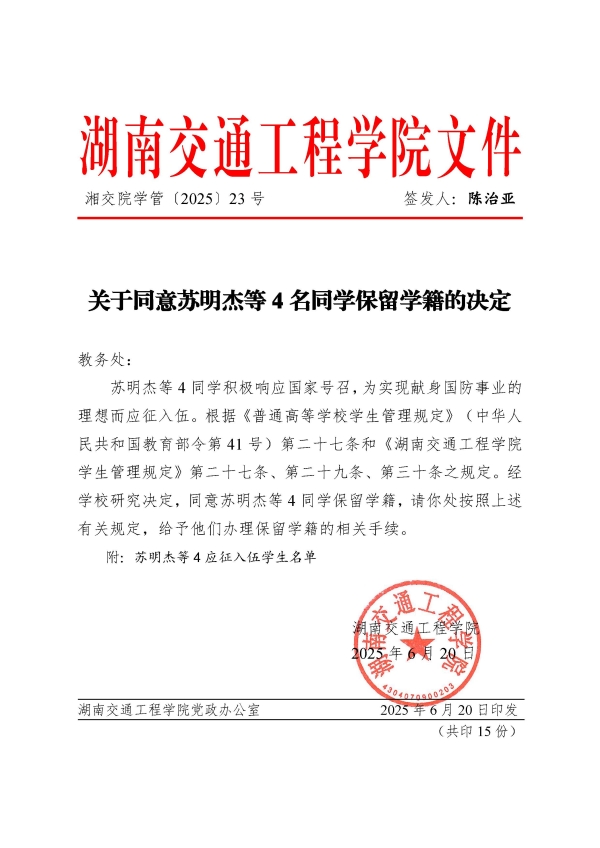 关于同意苏明杰等4名同学保留学籍的决定(湘交院学管〔2025〕23号)