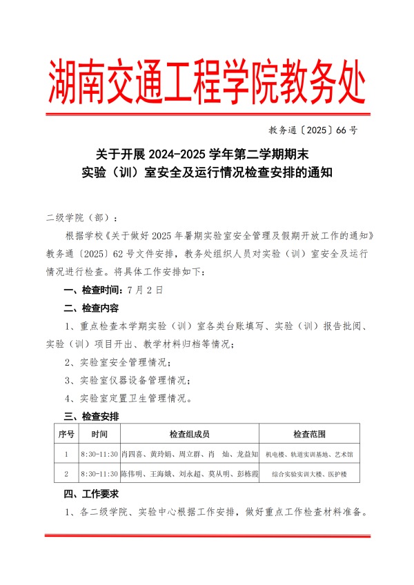 关于开展2024-2025学年第二学期期末实验(训)室安全及运行情况检查安排的通知