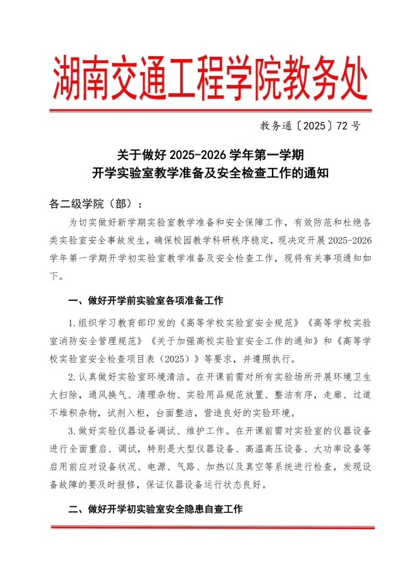 关于做好2025-2026学年第一学期开学实验室教学准备及安全检查工作的通知