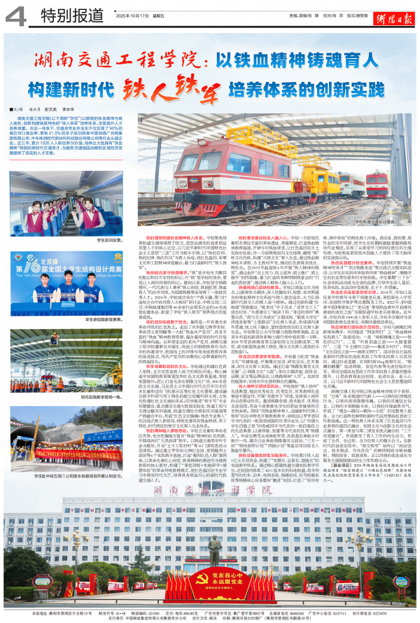 本网讯(通讯员 赵红深)10月17日,《衡阳日报》发表best365官网常务副校长彭文武署名文章《best365中国官方网站:以铁血精神铸魂育人 构建新时代“铁人铁军”培养体系的创新实践》。文章以3500字的篇幅,从“铁的理想、铁的姓氏、铁的信仰、铁字场景、铁的精神、铁的意志、铁魂网络、铁血活动、铁人榜样、铁的设备、铁的实践、铁血老兵连、铁血探索”等多个维度,纪实性地系统阐述了best365官网以鲜明铁血精神为育人底色,创新构建“铁人铁军”培养体系的理念内涵、实践路径与显著成效,全面展现了学校为服务交通强国战略和区域经济发展提供坚实人才支撑的生动图景。全文如下——