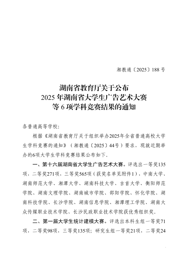 转发:湖南省教育厅关于公布2025 年湖南省大学生广告艺术大赛等 6 项学科竞赛结果的通知