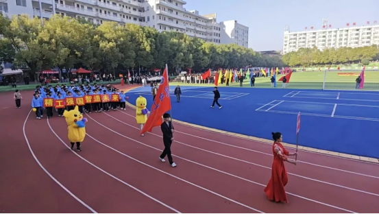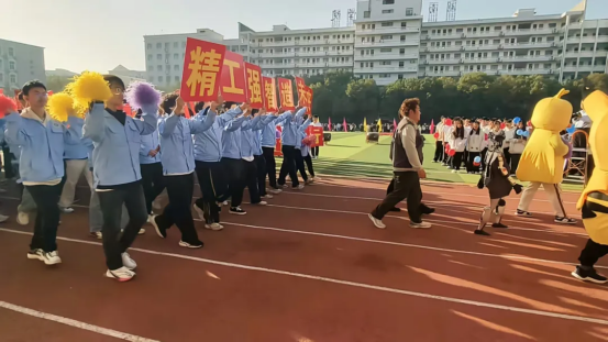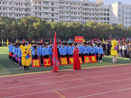 方阵变幻出“精工强国”和“智造未来”的字样,将专业特色与体育精神完美融合。“精工强国,智造未来”——机电学子通过这一创意表演,向全校师生展示了学院将传统工匠精神与现代科技相结合的教育理念。他们坚定的眼神、昂扬的姿态,不仅表达了对机电专业的热爱,更展现了对未来科技的憧憬和信心。