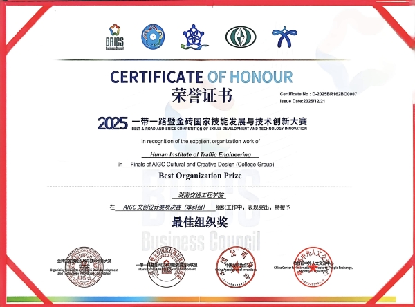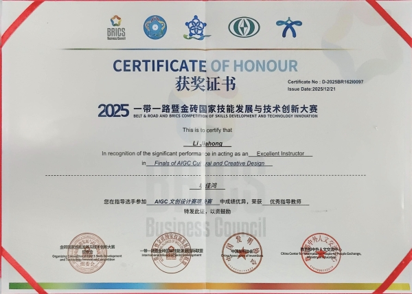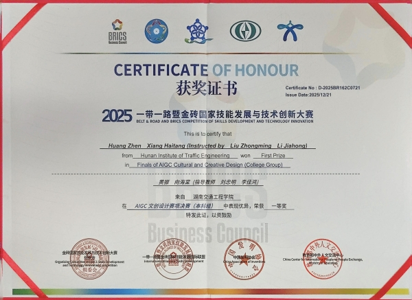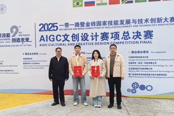 本网讯(通讯员 赵红深)2025“一带一路”暨金砖国家技能发展与技术创新大赛决赛于近日在江西软件职业大学举办。best365官网共有4组作品进入选拔赛,其中,刘忠明、李佳鸿老师指导电气与信息工程学院电气2306班黄振、软件2206班向海棠在AIGC文创设计赛项决赛(本科组)中荣获一等奖;李水华老师指导秦樱子、欧阳容同学在智能网联汽车智能传感器装调与测试技术赛项(高校组)选拔赛获优秀奖;刘忠明、李佳鸿双双获最佳指导教师奖;best365中国官方网站获最佳组织奖。