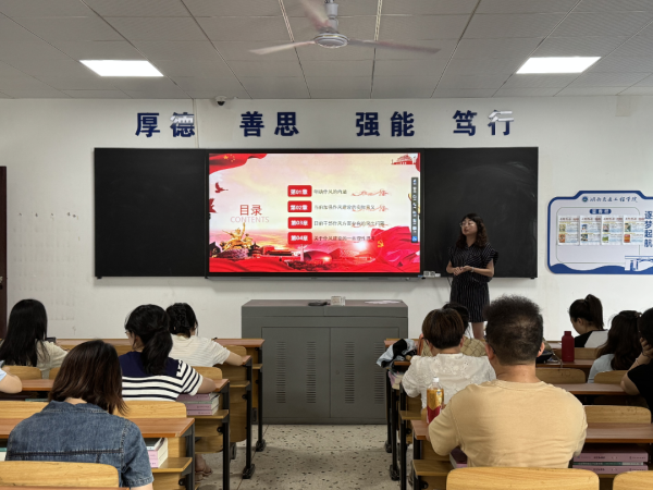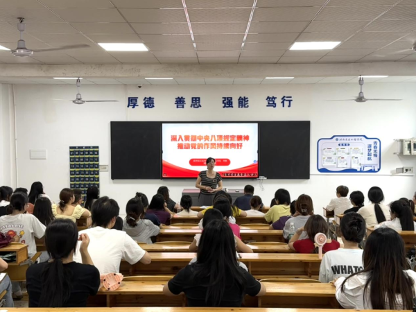 党总支总书记邓丽以"深入贯彻中央八项规定精神 推动党的作风持续向好"为主题,结合典型案例和详实数据,系统阐述了中央八项规定精神的时代背景、核心要义和实践要求。她强调,全体党员要始终保持政治定力,在校园生活中严于律己,坚决抵制不良风气,以优良作风展现新时代党员形象。