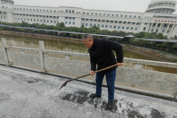 本网讯(通讯员 赵红深)1月21日晚,雁城第一场冰雪降临,路面结冰打滑。为确保22日上午在航母楼一楼会议室举行的学校教代会、工代会顺利召开,为全力消除道路积雪结冰给代表们参会出行带来的安全隐患,机关党总支一大早就组织党员刘国祥、刘庆平、张红艳、王利和霍志玮等同志开展“清积雪、保安全、作表率”活动。