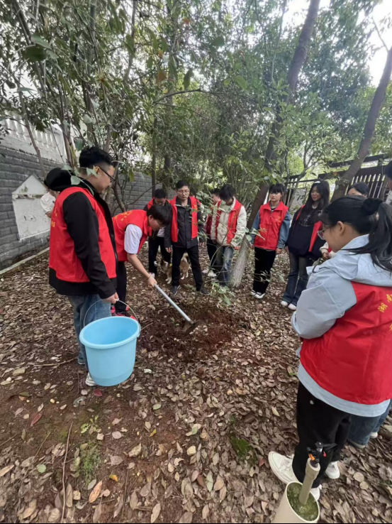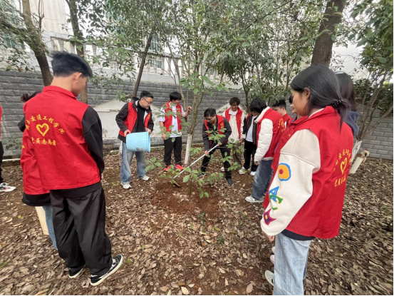 活动现场,志愿者身着红马甲,手持铁锹等工具,迅速投入到植树劳动中。大家分工协作、默契配合,挥锹铲土、扶正植株、踏土夯实、提桶浇水,每一道工序都一丝不苟、有条不紊,展现出精益求精的工匠精神。师生同心、携手同行,现场氛围热烈且温馨,充分展现出师生积极向上、乐于奉献的良好精神风貌。