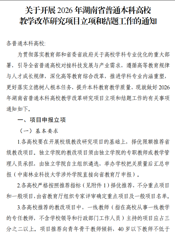 (转发)关于开展2026年湖南省普通本科高校教学改革研究项目立项和结题工作的通知