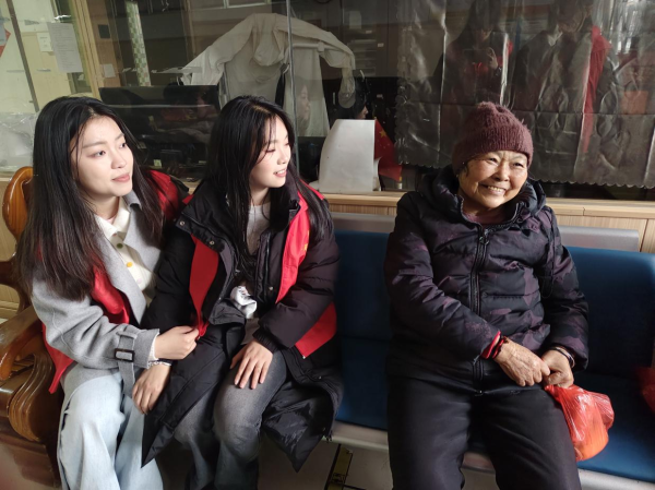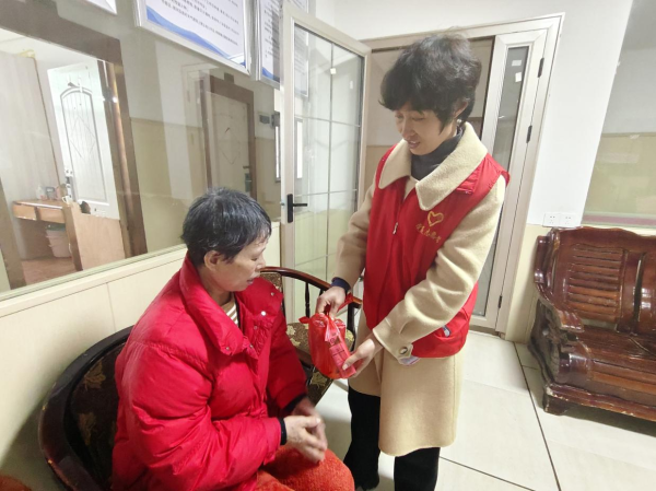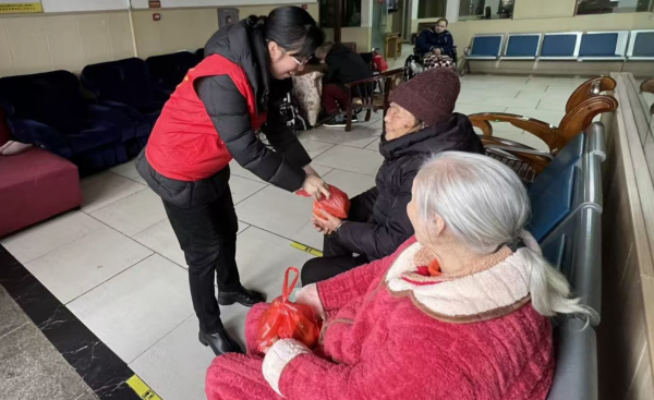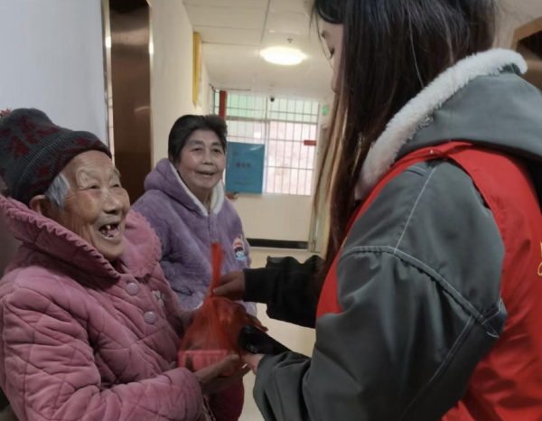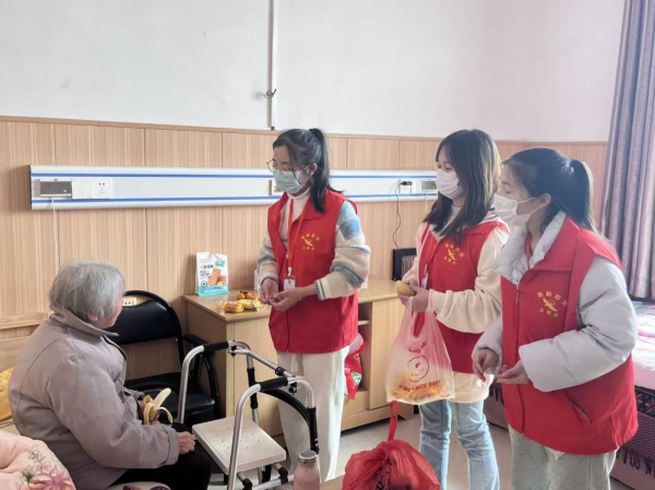 抵达敬老院后,大家为老人们送上水果、面包、牛奶等慰问品,将温暖与心意亲手递到老人手中。学院党总支书记邓丽、党总支副书记兼团总支书记刘建军和刘春香老师也来到活动现场,和志愿者们一起为老人们送上春日的温暖问候。随后,医护党员师生化身“健康讲师”,结合春季特点开展健康宣教:讲解流感预防要点,分享低盐低脂、温补养胃的春季营养饮食建议,普及高血压、关节炎等老年常见病护理知识,用专业所学为老人的健康提供贴心建议。