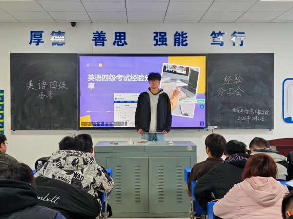 此次四级备考经验分享会为学院学子搭建了高效便捷的学习交流平台,在缓解备考焦虑的同时,也为即将到来的四级考试注入了动力。下一步,电气与信息工程学院将继续聚焦学生学业发展需求,持续开展形式多样的学风建设活动,助力学生夯实基础、稳步前行。(一审:蒋晨轩 二审:李燕丽 三审:易令华)