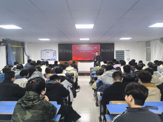 动员会伊始,辅导员潘登峰通报了前期考研意向调研情况。数据显示,2023级机械专业学生中已有超六成明确考研意向。他分析了同学们在院校选择、复习规划等方面存在的普遍困惑,并表示学院将为此提供全流程的政策、资源与心理支持。