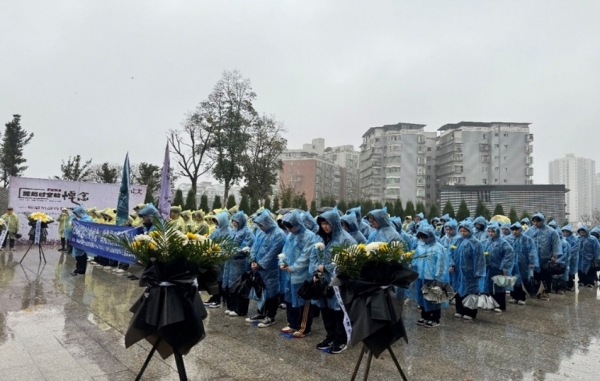 张家山是衡阳保卫战中最为惨烈的战场之一,三千余名抗日将士的忠骸长眠于此。当日现场庄严肃穆,低沉的哀乐回荡,全体人员列队肃立、集体默哀,向先烈致以深切哀悼与崇高敬意。