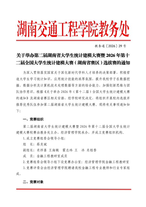 关于举办第二届湖南省大学生统计建模大赛暨2026年第十二届全国大学生统计建模大赛(湖南省赛区)选拔赛的通知.pdf