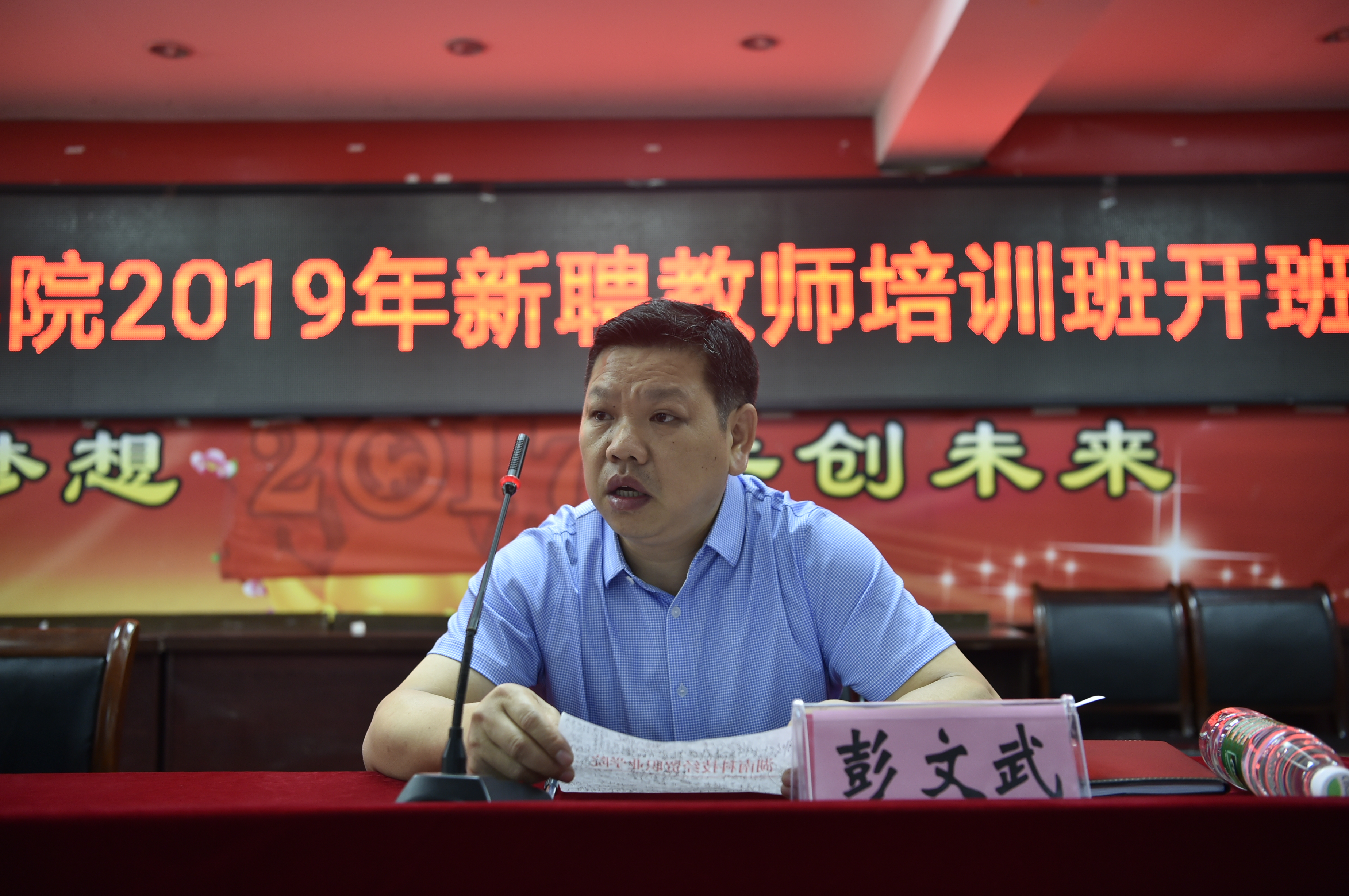 本网讯(通讯员摄影李建华)为帮助新入职教师更好地胜任教学工作和履行岗位职责,提高专业素养和教学能力,积极融入学校的发展和建设,8月27日上午,学校在体育馆101会议大厅举行2019年新聘教师培训开班典礼,董事长刘福生,党委书记苏玲,副董事长、第一副校长刘杰,常务副校长彭文武,副校长黄名文、董晔卉、刘孟祥出席开班典礼,二级学院书记、院长及人事处、教务处、宣传部等部门负责人以及2019年新入职的48名教师参加了开班仪式。仪式由彭文武主持。
