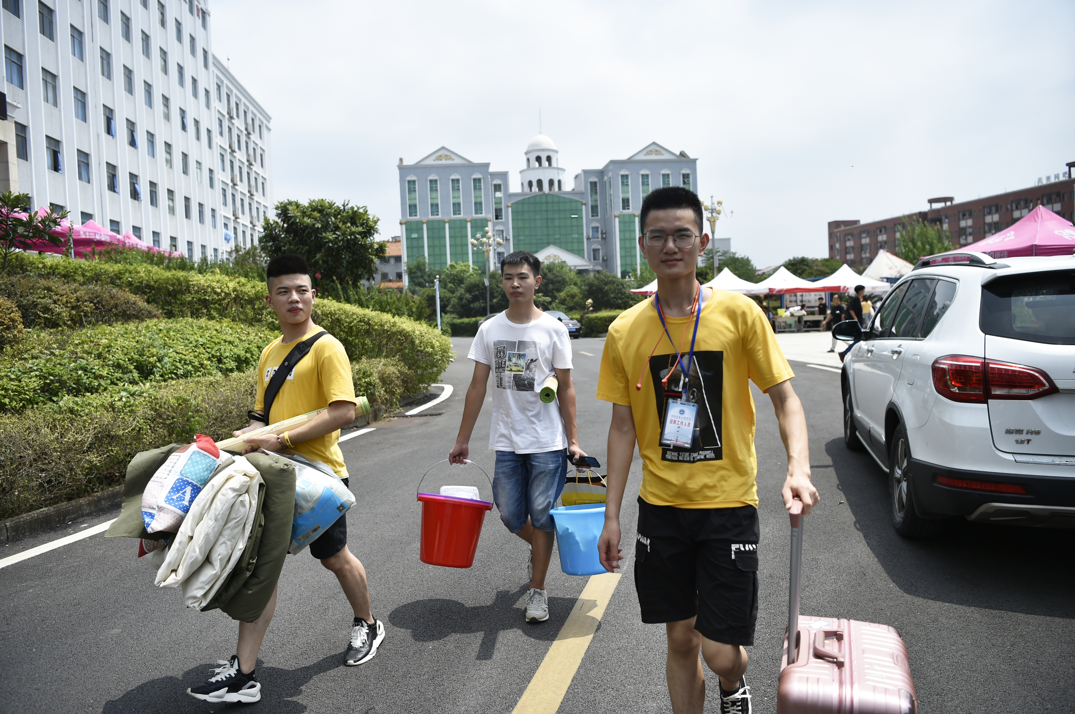 迎新志愿者热情地为新生提行李向宿舍走去。