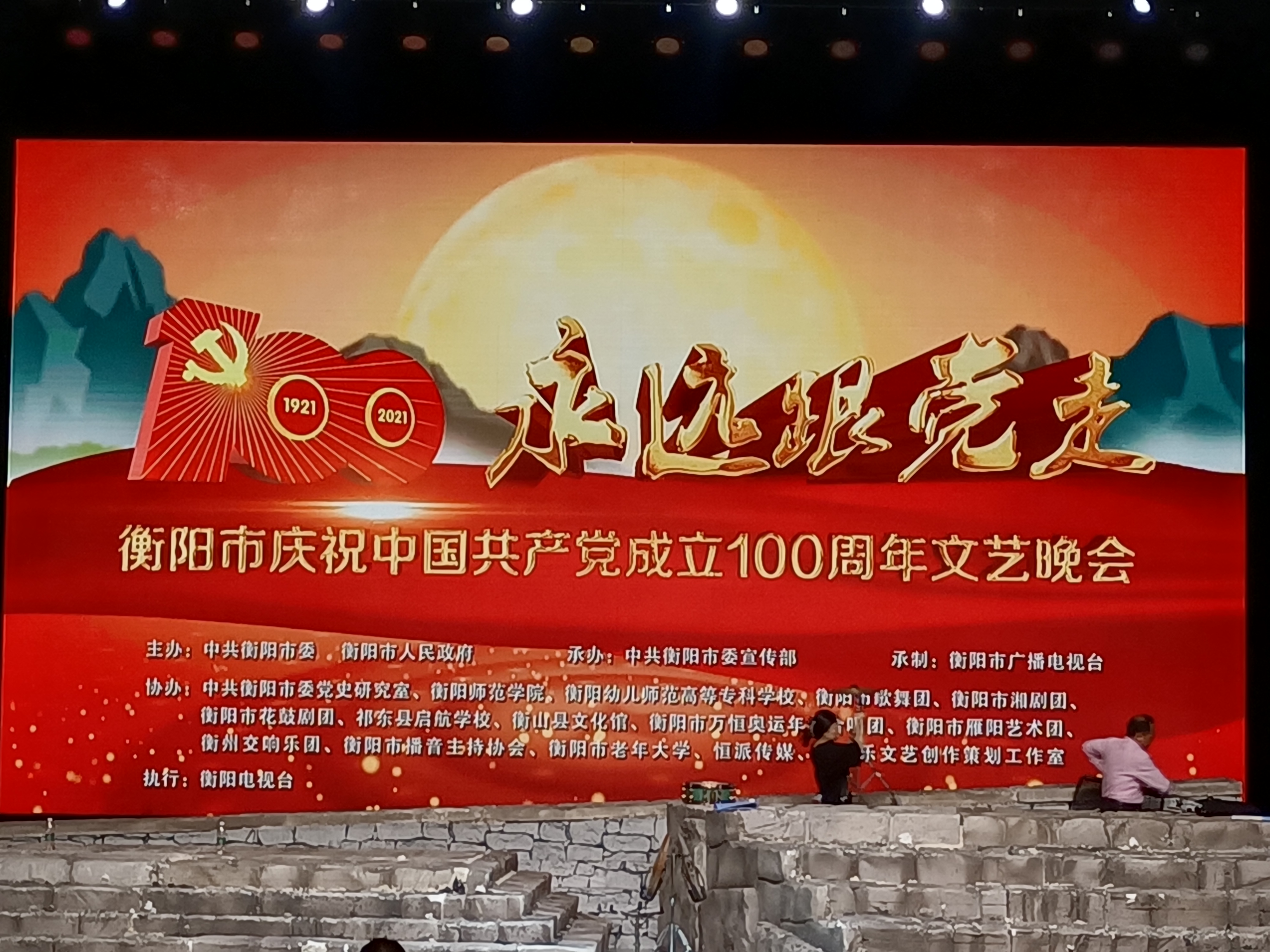 本网讯(记者 赵红深  摄影 李建华)6月30日晚,由中共衡阳市委、衡阳市人民政府主办,中共衡阳市委宣传部承办,衡阳市广播电视台承制,衡阳电视台执行的“永远跟党走”衡阳市庆祝中国共产党成立100周年文艺晚会在衡阳市广电中心影视大厅演出。晚会分为开天辟地——只要主义真,改天换地——峥嵘岁月稠,翻天覆地——风来满眼春,惊天动地——奋进新时代四个篇章,生动展现中国共产党成立百年走过的光辉历程,讴歌新时代人民群众的爱党爱国情怀。参与的演职人员400余名。