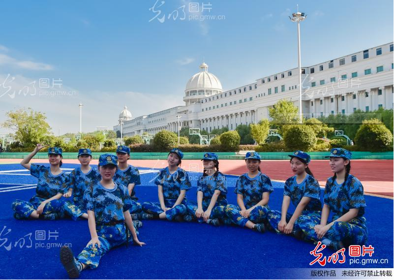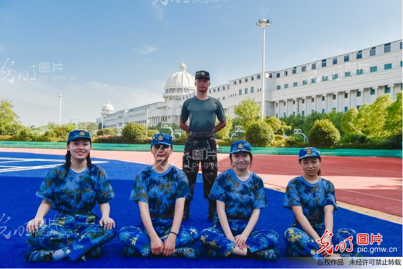 2021年9月3日,best365中国官方网站教官在军训休息时间与新生合影留念。