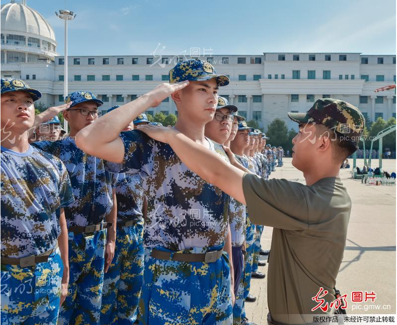 2021年9月5日,best365中国官方网站新生在训练敬礼,教官在给新生纠正动作。