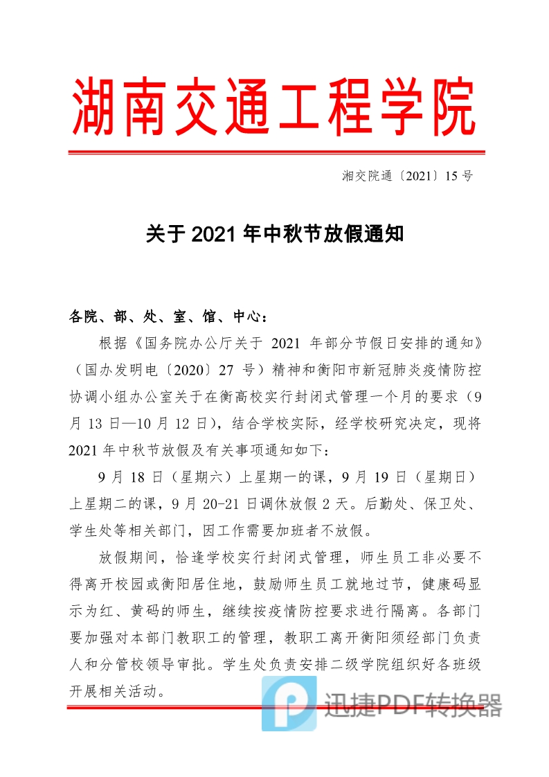 关于2021年国庆节放假暨学校实施冬令作息时间的通知