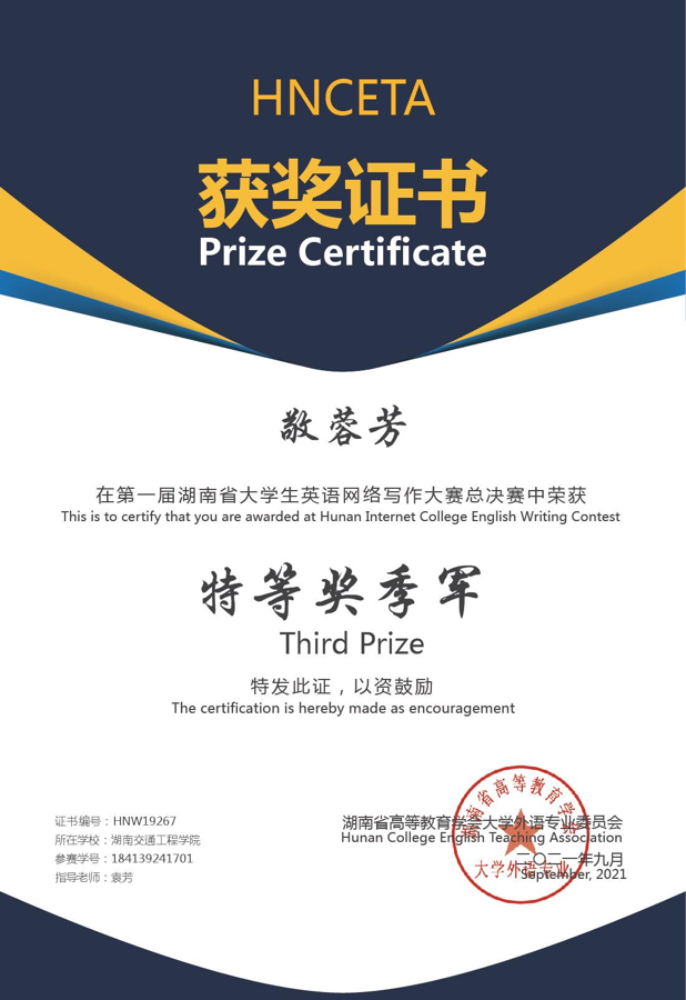 best365官网敬蓉芳同学获首届湖南省大学生英语 网络写作大赛特等奖季军
