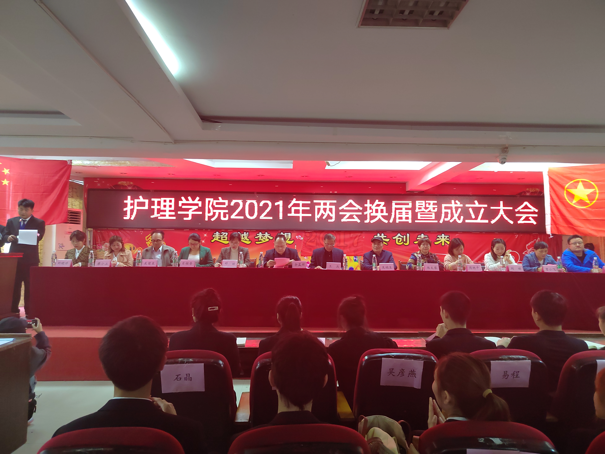 两会成立大会在《中国共青团团歌》中圆满结束。相信在学校领导的关心下,在学院领导老师的指导下,新一届两会干部将不负领导期望,团结一心,奋发努力,全心全心为师生服务、为学校做贡献,谱写出更加辉煌的新篇章,护理学院也将会更加辉煌!