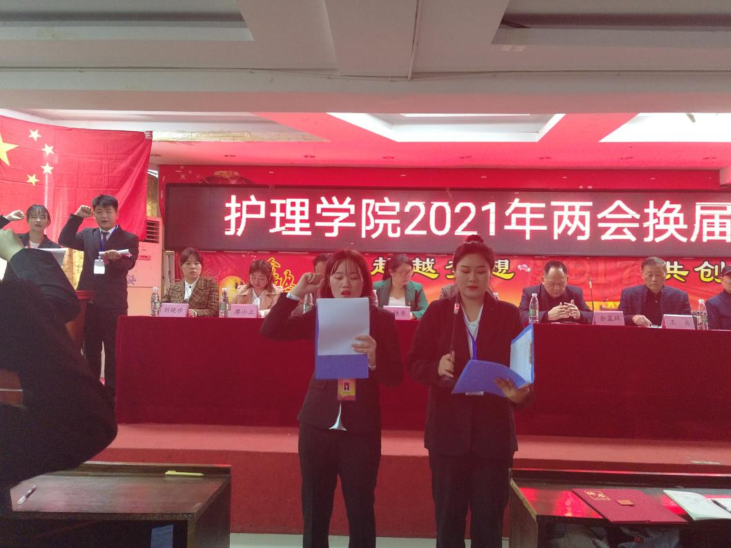 然后,护理学院团总支常务副书记谭海桃、学生会执行主席石晶代表新当选的学生干部发言,并带领全体学生干部宣誓。
