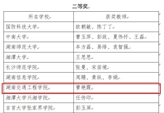 热烈祝贺我院教师曹艳霞荣获湖南省普通高校教师课堂教学竞赛二等奖