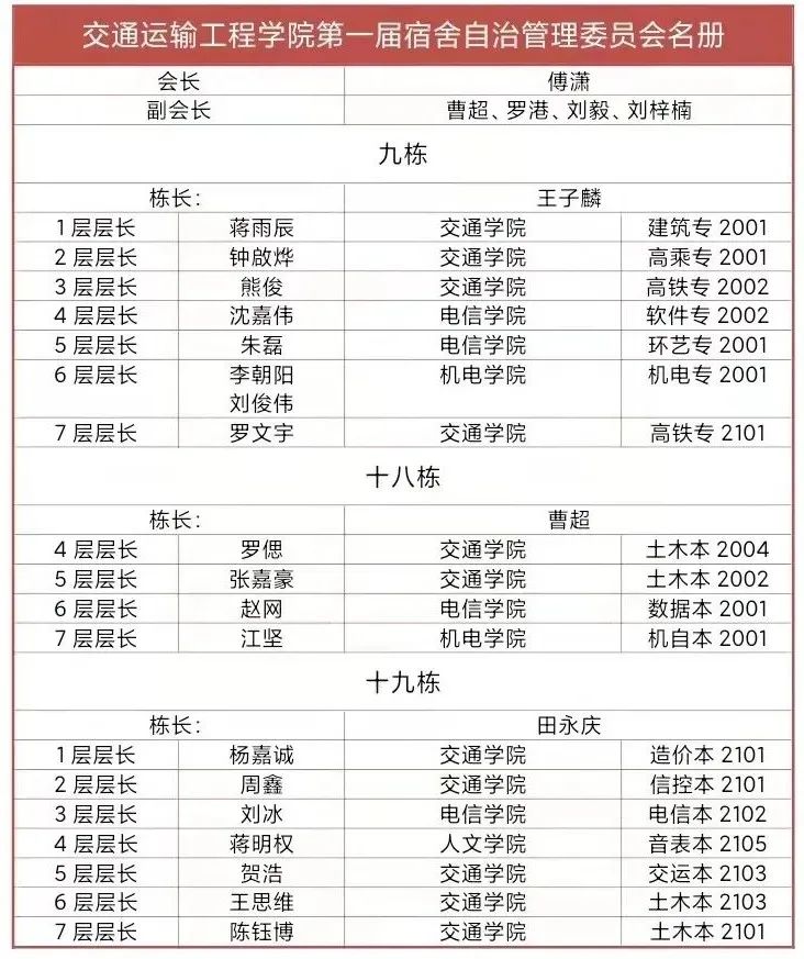 导语:学生宿舍自治管理委员会是由院学生会宿管部成员、栋长、层长、寝室长及先进学生代表组成,负责参与学生宿舍管理事宜。组织学生认真执行学院关于宿舍管理的各项条例、办法、规定、制度。每栋宿舍楼成立学生自治管理小组,负责本楼的学生宿舍管理事宜。每个寝室设寝室长1名,每层设层长1-4名,每个楼栋设栋长1名。