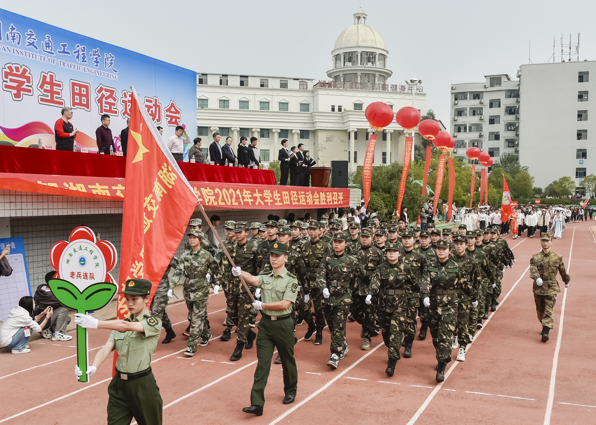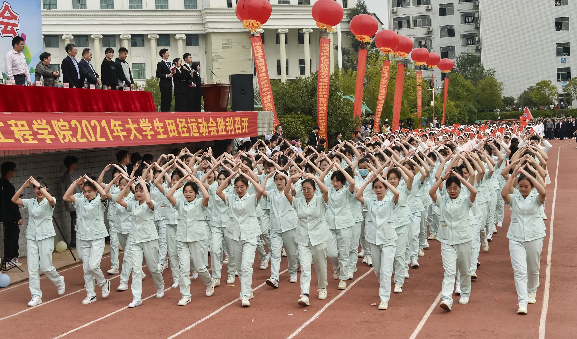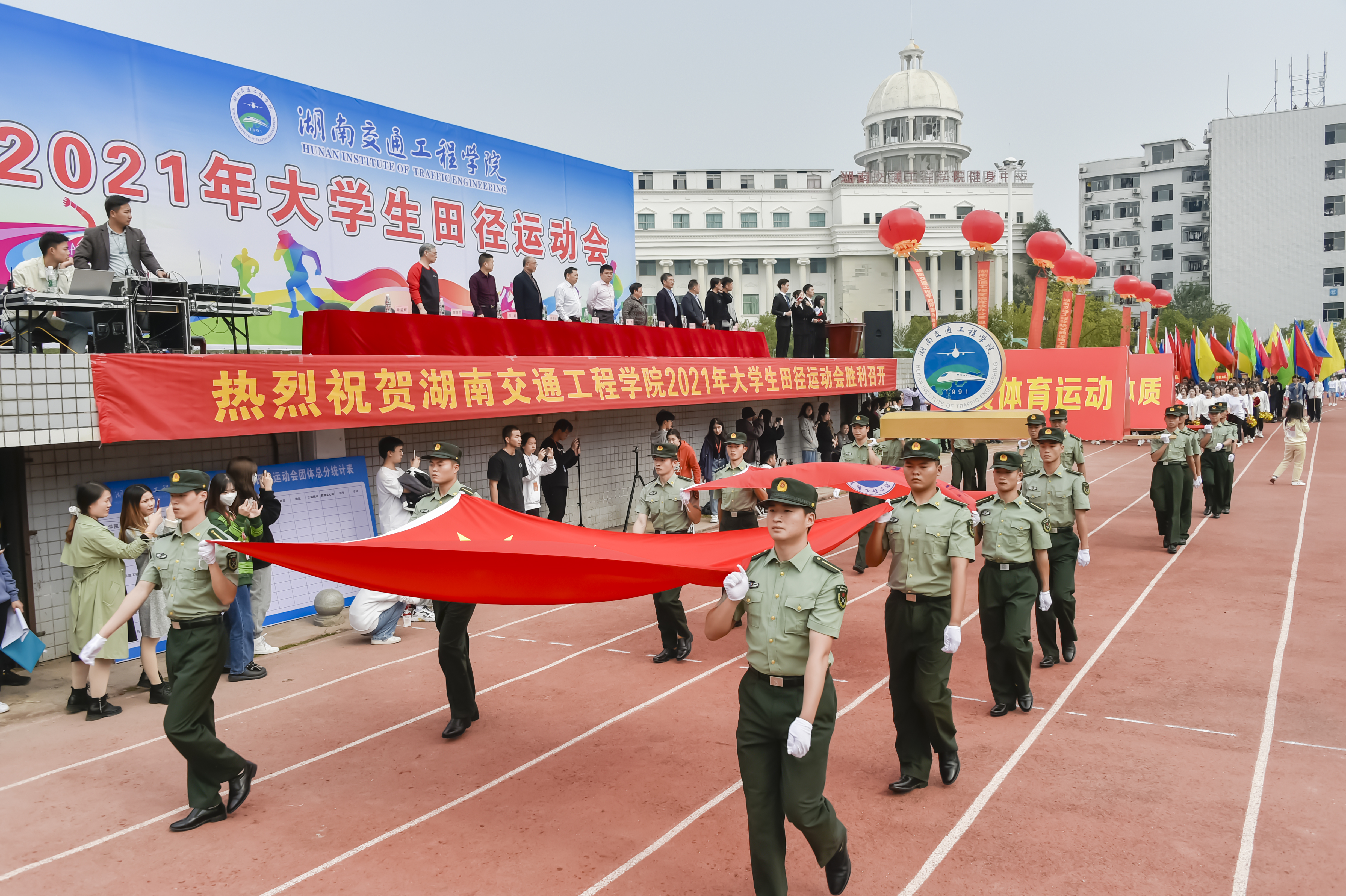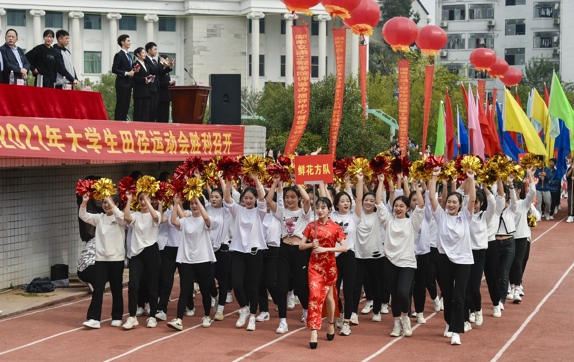 以拼搏致青春,以阳光致芳华!铸教育强国之魂,圆人才强校之梦。在这美好的金秋时节,学校教育事业篷勃发展,大力推进本科教学工作合格评估建设进程的重要时刻,best365官网师生于10月27日下午齐聚一堂,隆重召开以“弘扬湘交精神,锻炼强健体魄,激扬生命热情”为主题的2021年秋季大学生田径运动会。副董事长、执行校长刘杰, 名誉校长刘平娥、常务副校长彭文武、党委副书记李先聪、纪委书记刘毅, 副校长刘初生、樊晓平、余孟辉等校领导在主席台就坐。运动员、裁判员、教职工代表、学生代表5000余人参加开幕式。余孟辉主持开幕式。