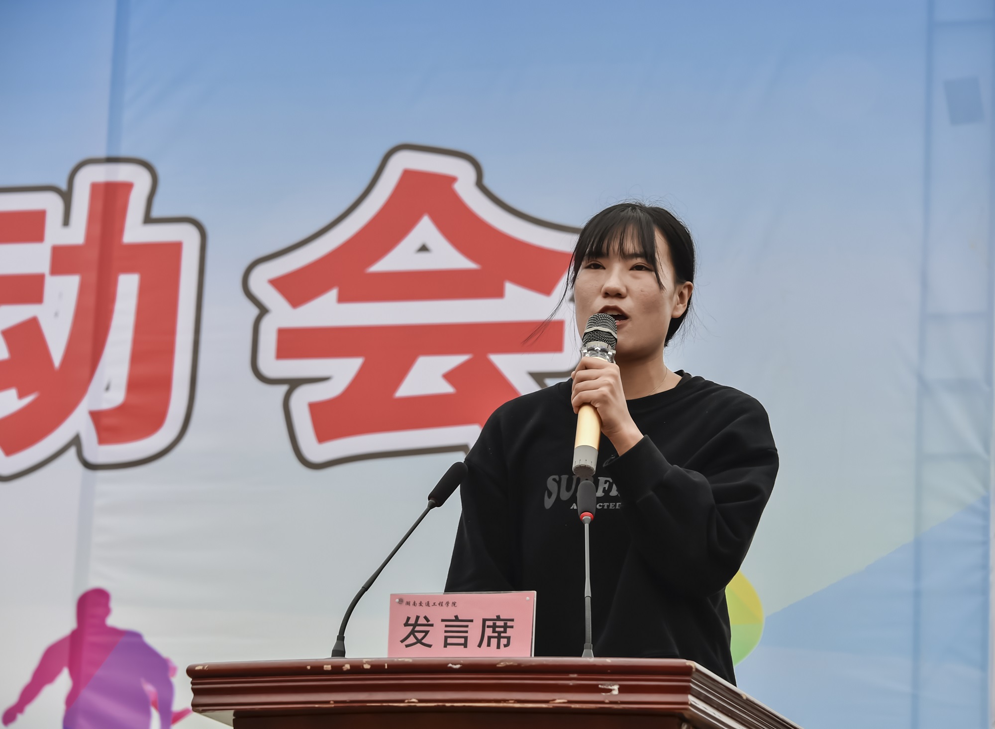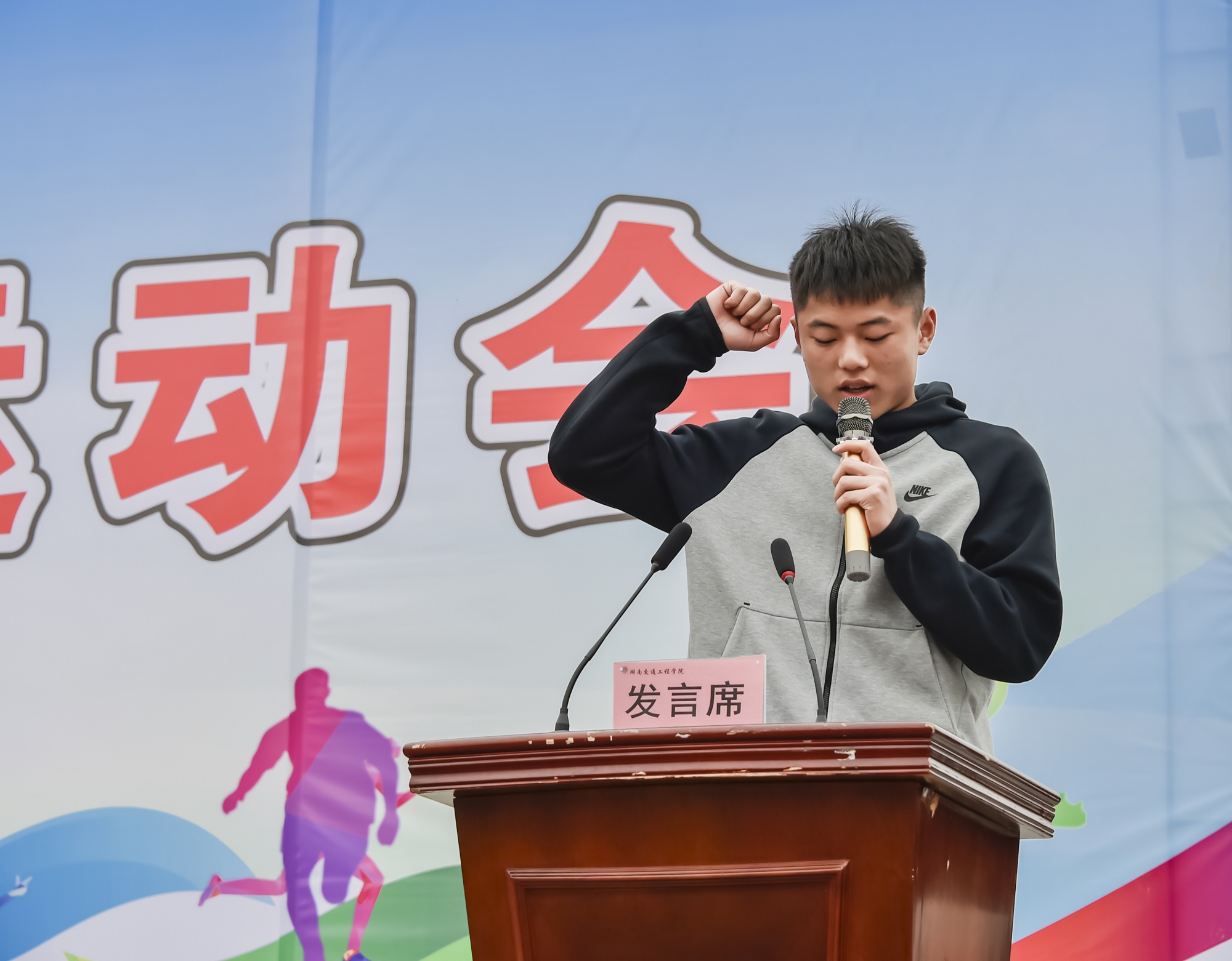 机电工程学院机制专2001杨佳琪同学代表运动员宣誓:将服从领导,遵守纪律,尊重裁判,尊重对手,正确对待,赛出水平,赛出风格,以饱满热情积极参加本届运动会。
