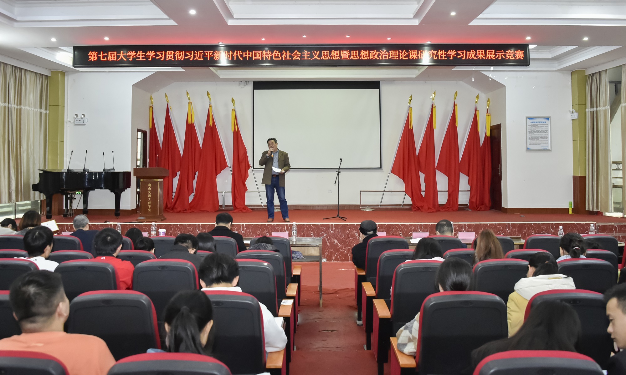 本网讯记者  赵红深  摄影 李建华为深入贯彻落实习近平总书记“七一”重要讲话精神,贯彻落实学校思想政治理论课教师座谈会和中共中央办公厅、国务院办公厅《关于深化新时代学校思想政治理论课改革创新的若干意见》等会议和文件精神,推进思想政治理论课建设改革创新,激发大学生的理论学习积极性,全面提升学生思想政治理论素养,11月16日下午,学校在航母楼一楼学术报告厅举行第七届大学生学习贯彻习近平新时代中国特色社会主义思想暨思想政治理论课研究性学习成果展示竞赛决赛。党委副书记李先聪出席活动并致开赛辞,相关科目教师和学生代表300余人参加比赛活动, 马克思主义学院书记 主持。