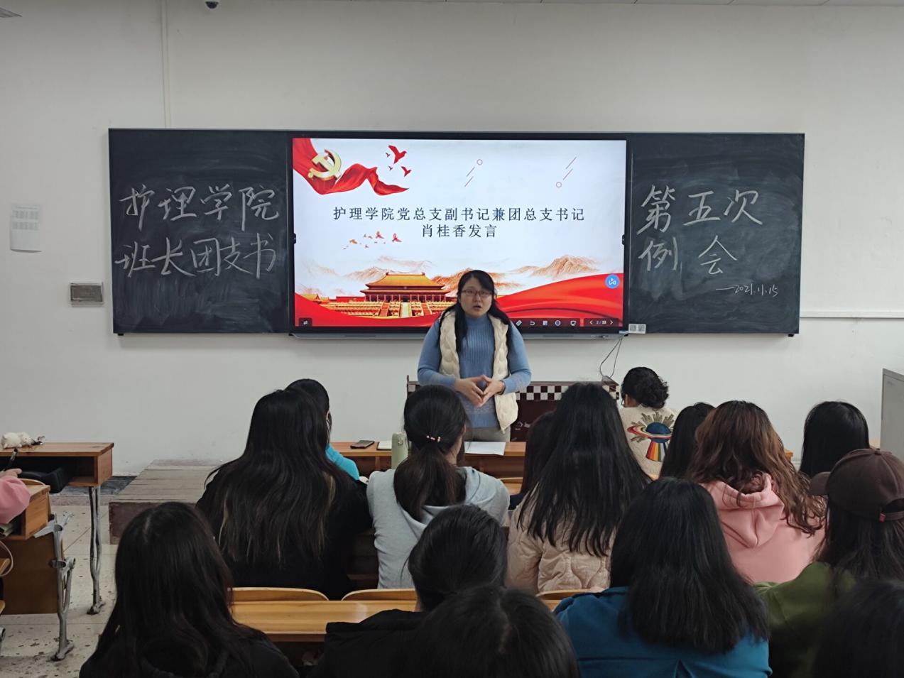 为进一步促进班级管理,护理学院于20211115日中午12:10在教学楼201教室召开本学期五次班长团支书例会。出席本次会议人员有:护理学院党总支书记邓丽,党总支副书记兼团总支书记肖桂香,学生干事老师陈文蓉,团总支、学生会主要干部以及各班班长支部书记