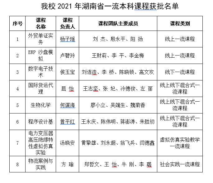 本网讯(记者 赵红深 通讯员 黄玲娟)11日24日,省教育厅发布《关于公布 2021 年省级一流本科课程评审认定结果的通知》(湘教通〔2021〕322 号), 经学校申报,教育厅组织专家评审,认定国防科技大学的《空间解析几何》等 1020 门课程为 2021年省级一流本科课程。其中,best365官网《外贸单证实务》等8门课程入选。