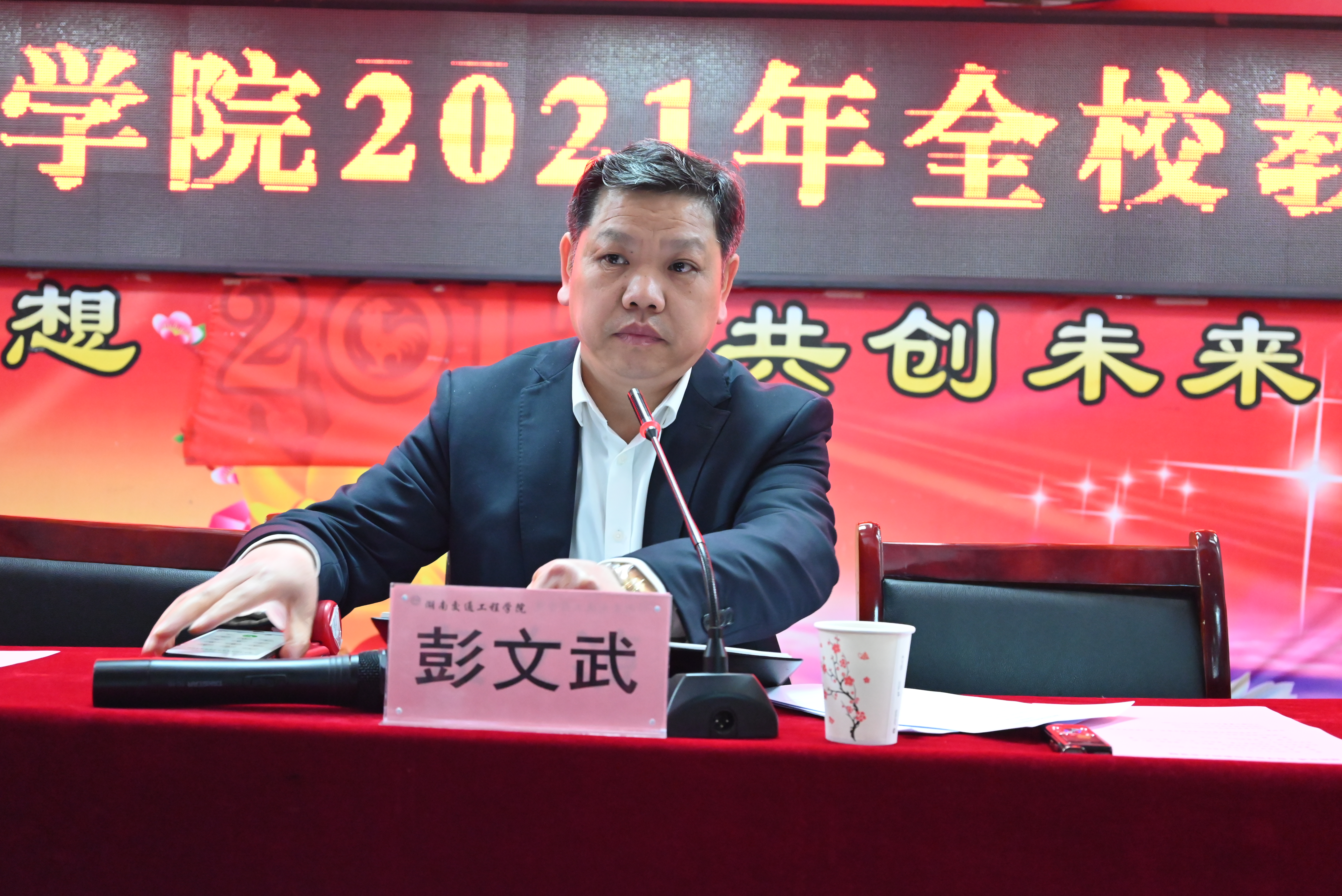 本网讯(记者 摄影 赵红深 实习记者 邓江林 刘文鑫)为全面贯彻教育部落实巡视整改要求,进一步修订完善课堂教学管理有关规定,加强课堂建设和管理,发挥好课堂教学的人才培养主渠道主阵地作用,切实提高教育教学质量,12月9日下午,学校在体育馆101会议室召开2021年下学期教师大会,全体校领导出席会议,常务副校长彭文武主持。