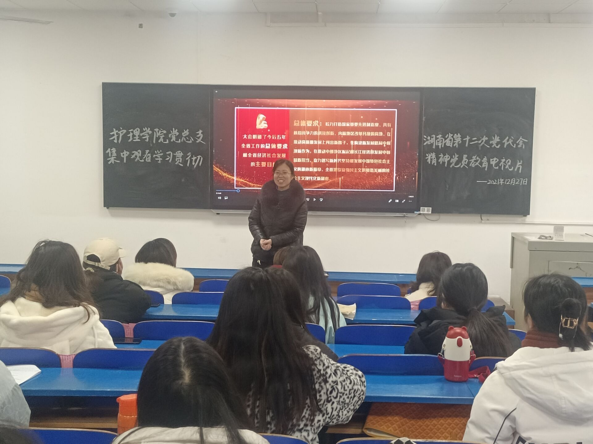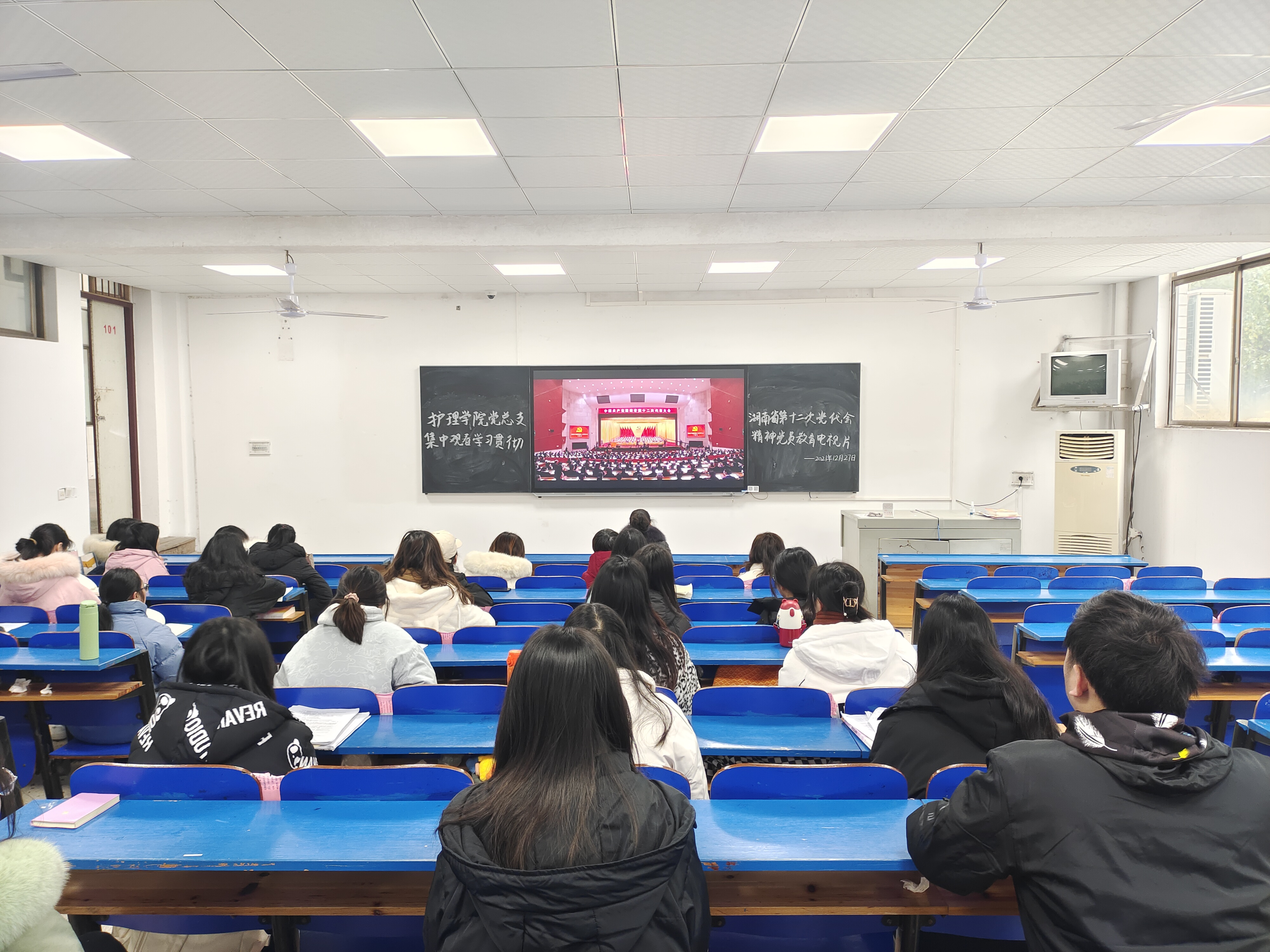 为深入学习贯彻省第十二次党代会精神,12月27日上午9:00,护理学院在教学楼101教室组织集中观看学习湖南省第十二次党代会精神党员教育电视片,护理学院全体党员参加,护理学院党总支书记邓丽同志导学。