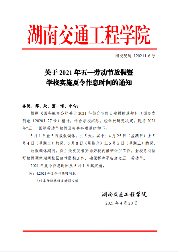 关于2021年五一劳动节放假暨学校实施夏令作息时间的通知