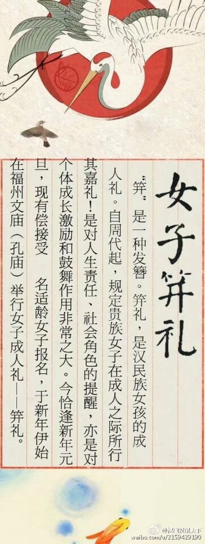 冠(笄)之礼是我国汉民族传统的成人礼,是汉民族宝贵的人文遗产。华夏先祖对于冠之礼十分的重视,所谓“冠者礼之始也”,《仪礼》将其列为开篇礼,可见它的重要性。
